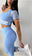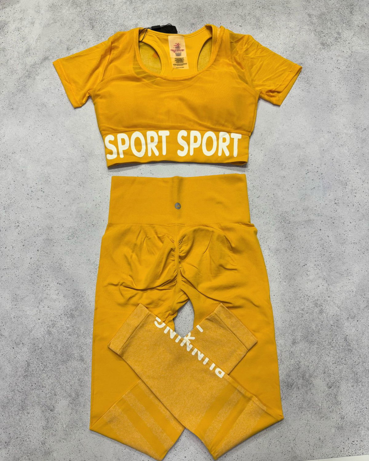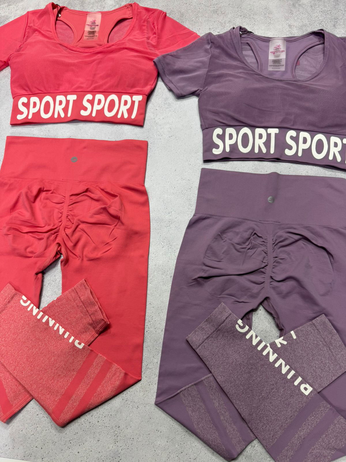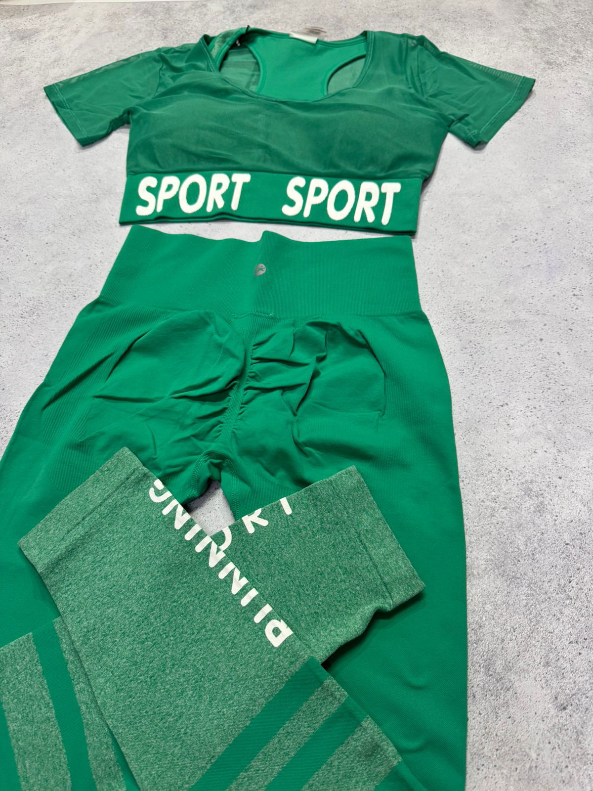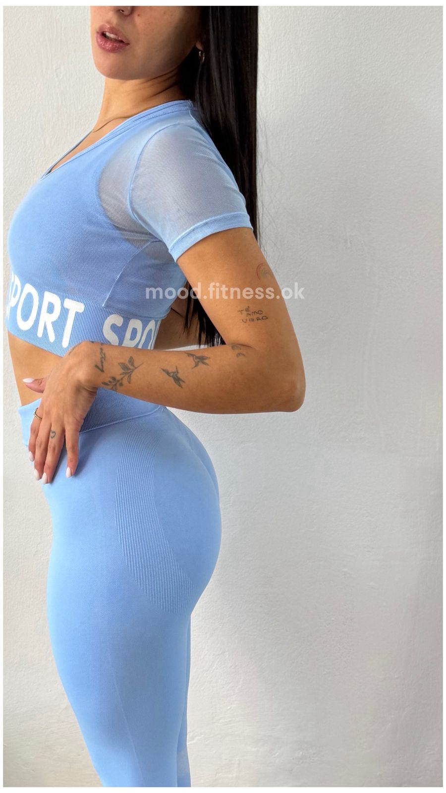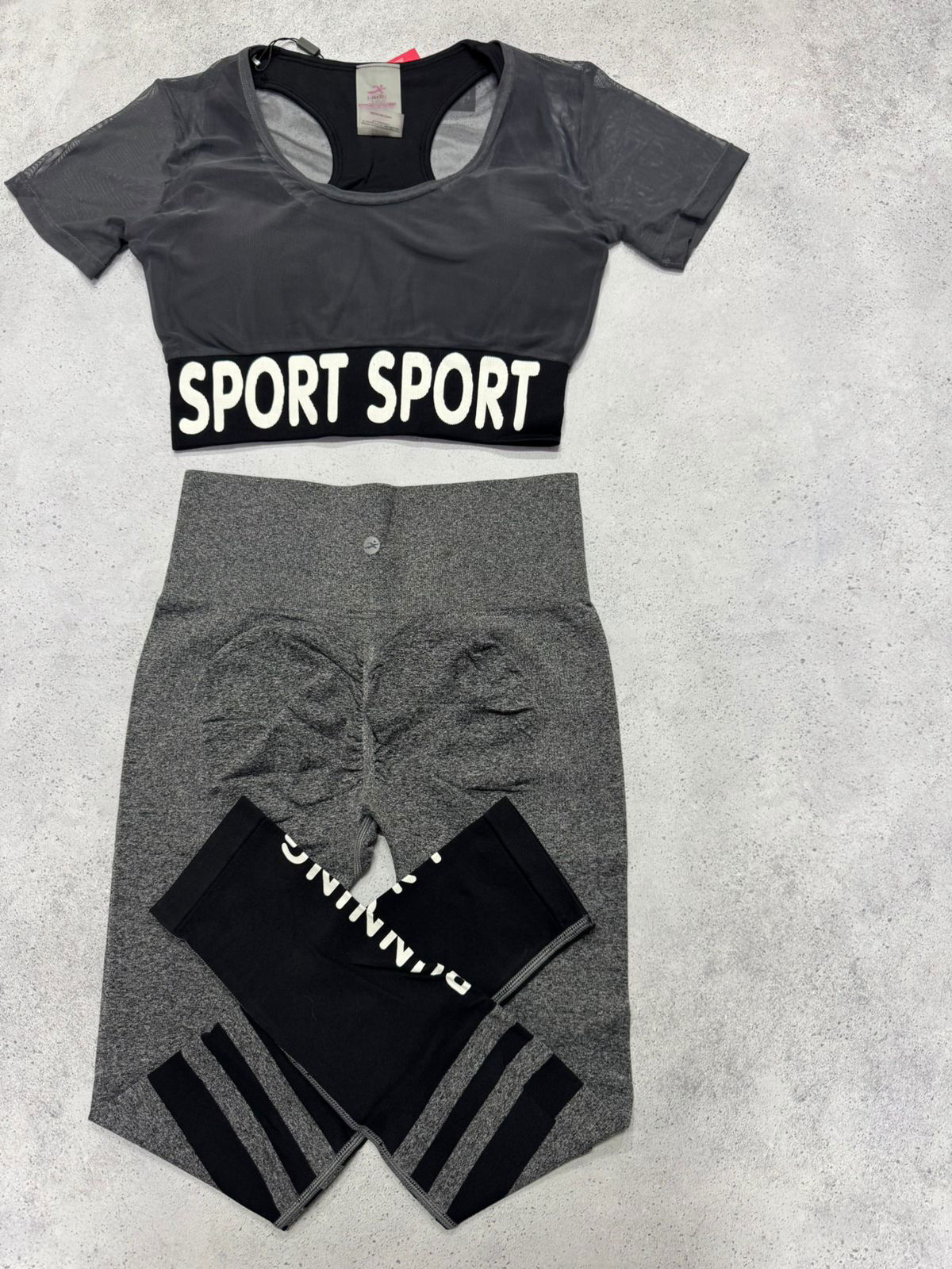 Set Irun original. Crop top con top, tasas incorporadas y transparencias+ calza larga con push up.